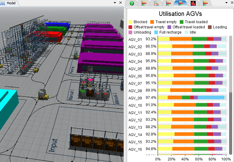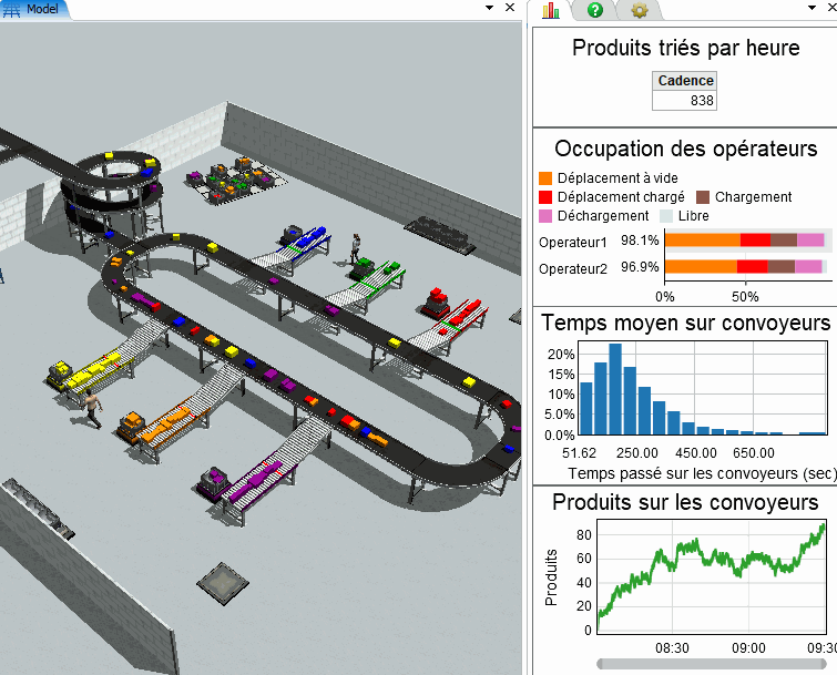 Ce modèle donne une vue d'ensemble sur les ressources disponibles dans la librairie FlexSim pour transporter des produits: AGV, opérateur, cariste, ascenseur, robot 6 axes, pont roulant, transtockeur.