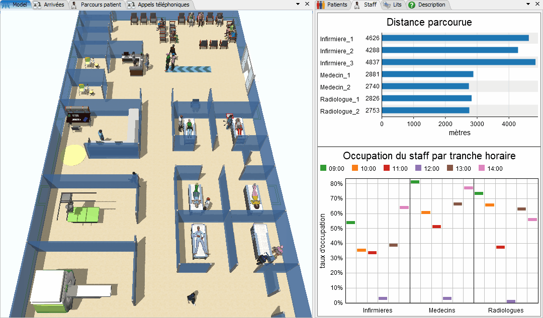 Ce modèle est un exemple de parcours patient dans une clinique: enregistrement, triage par une infirmière, examen par un médecin, soins (ECG, radio ou IRM) et enfin présentation du diagnostic au patient avant raccompagnement vers la sortie.