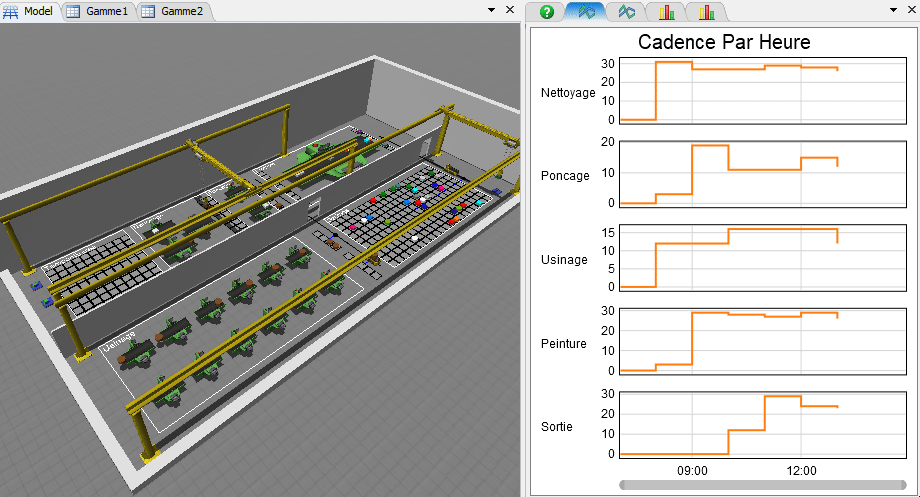 Ce modèle présente une approche possible pour simuler des gammes de fabrication. Une gamme est assignée à chaque produit entrant dans le modèle. Le produit traverse ensuite chaque étape de sa gamme.